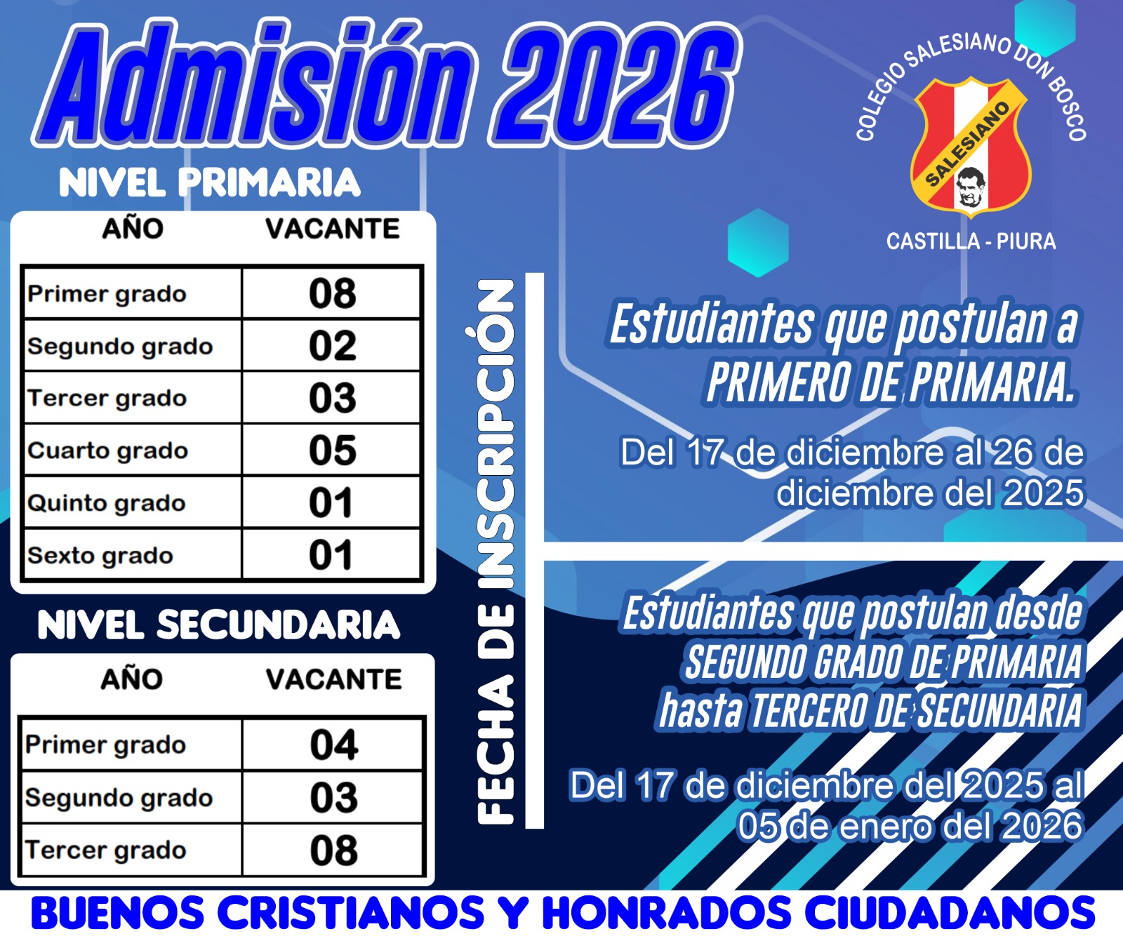 Te invitamos a ser parte de nuestra familia educativa en el Colegio Salesiano Don Bosco de Piura. Descubre cómo nuestra metodología única puede transformar la experiencia educativa de tus hijos. Estamos aquí para responder a todas tus preguntas y guiarte en el proceso de inscripción. No dudes en contactarnos para conocer más sobre nuestros programas académicos y actividades extracurriculares.